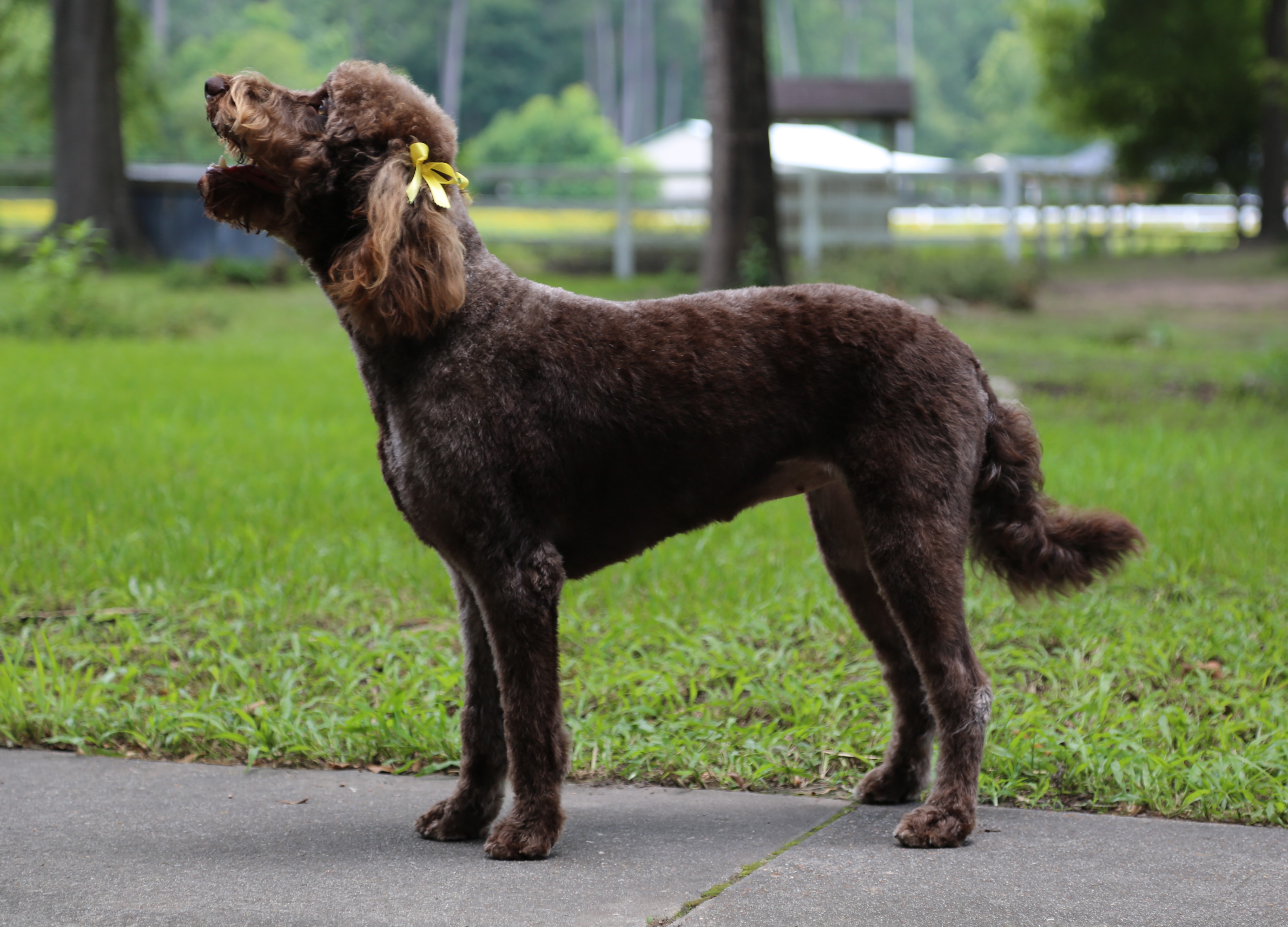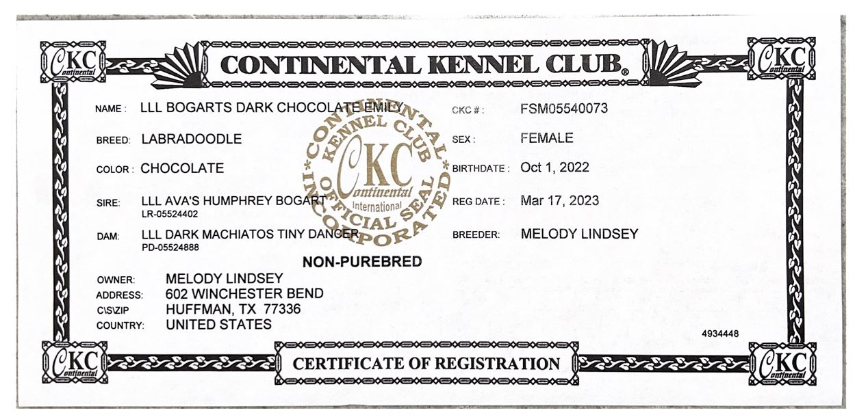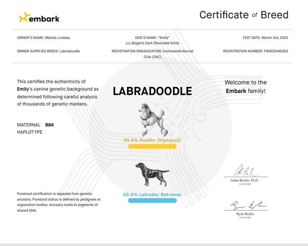 I am an F1 chocolate Labradoodle. I adore my family and am fiercely loyal. I have a lab like personality and enjoy swimming, chasing after any type of toy making me a very eager retriever. I am also an amazing mom. See my other pictures and credentials below.