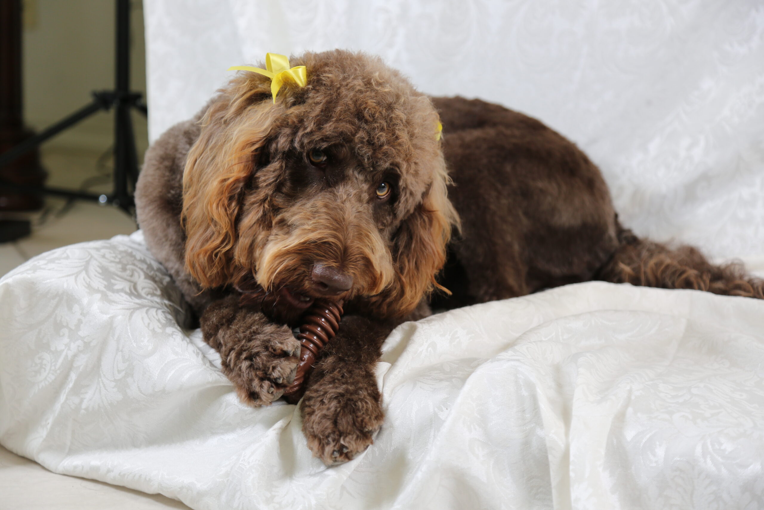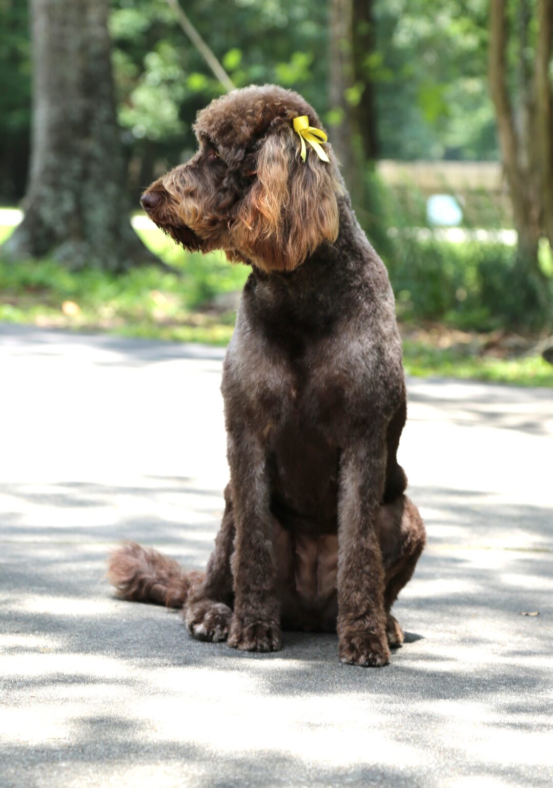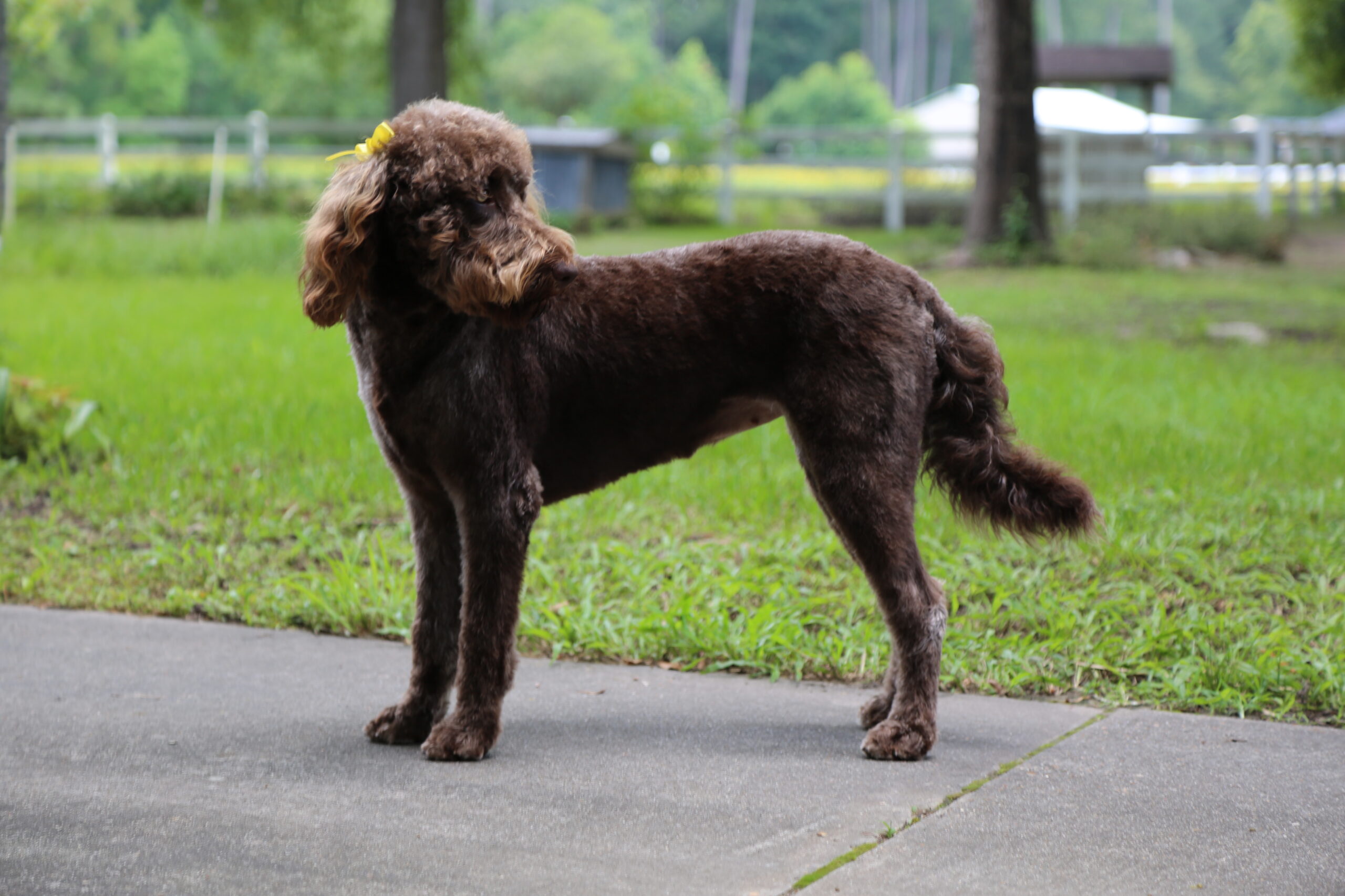 I am an F1 chocolate Labradoodle. I adore my family and am fiercely loyal. I have a lab like personality and enjoy swimming, chasing after any type of toy making me a very eager retriever. I am also an amazing mom. See my other pictures and credentials below.